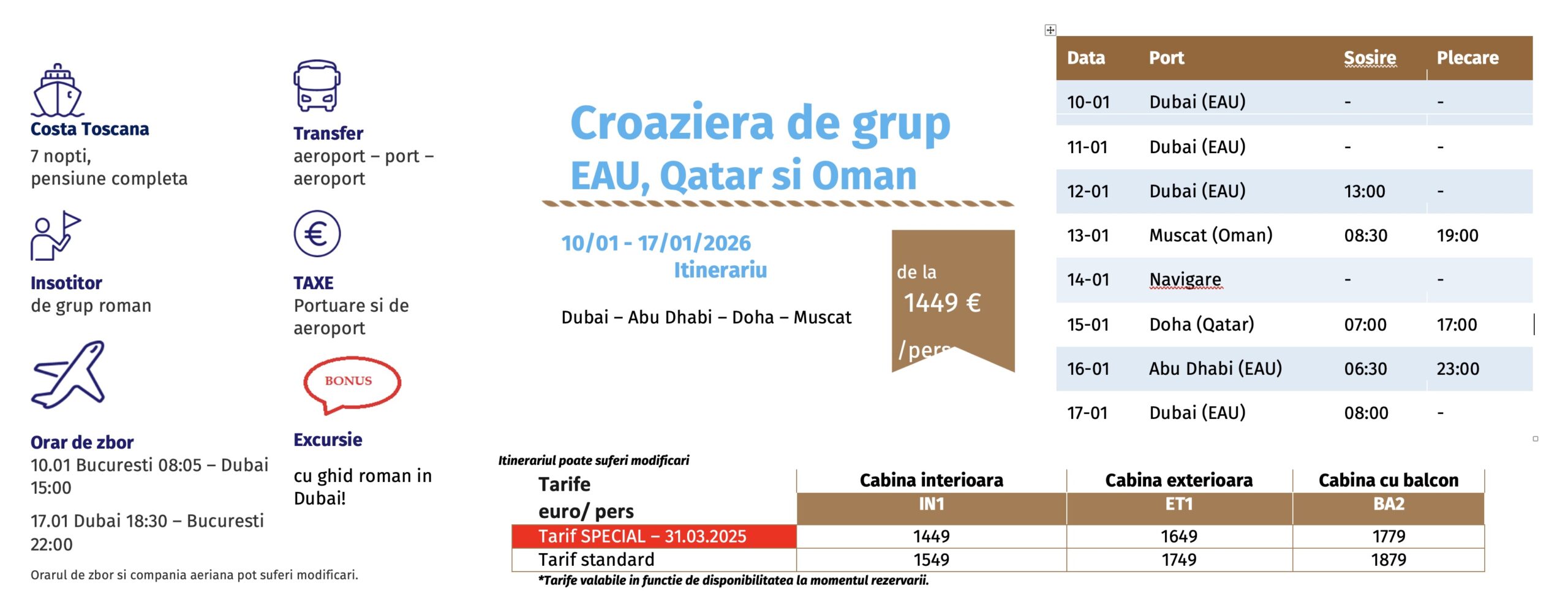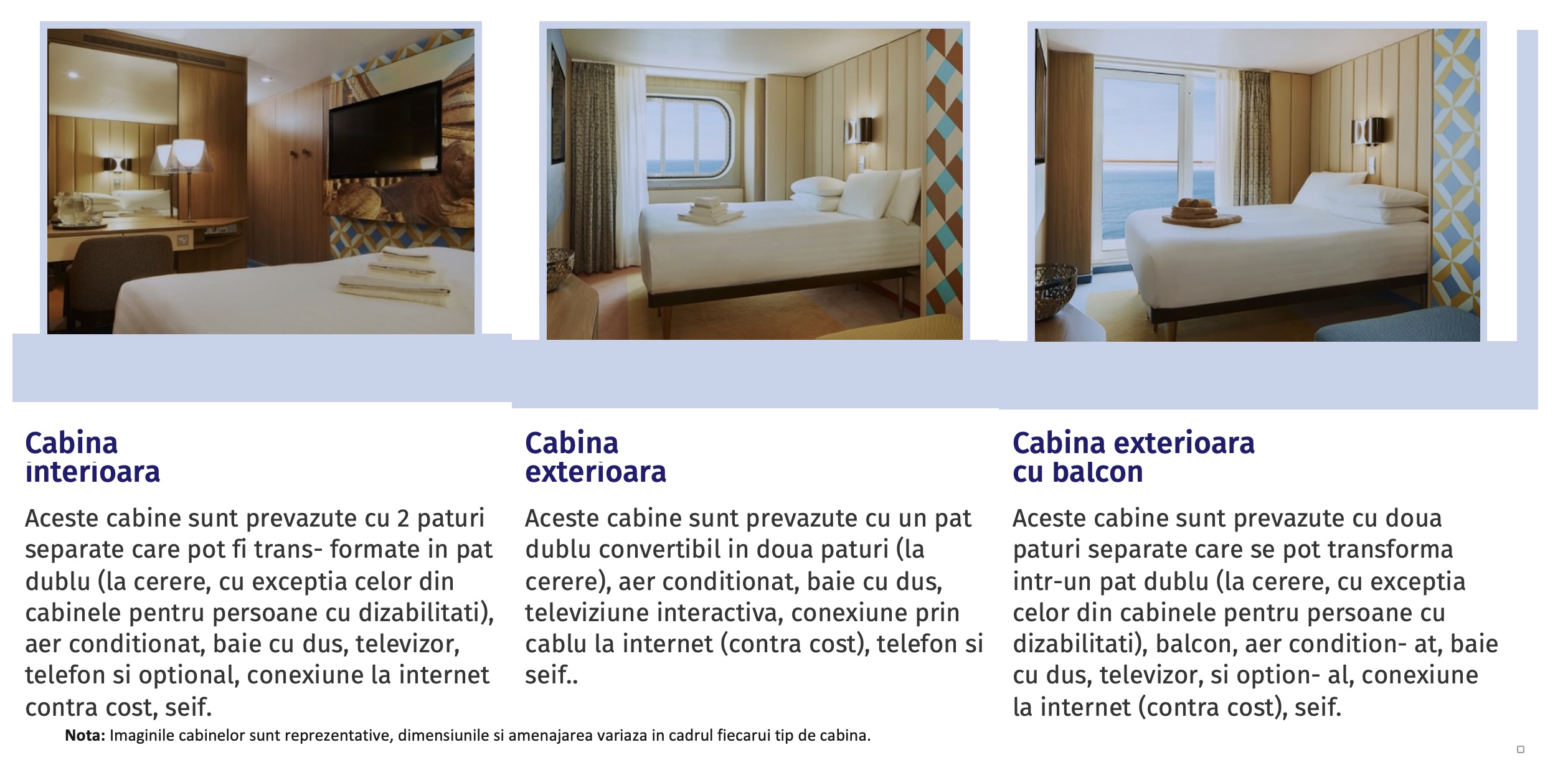 – cazare 7 nopti la bordul navei de croaziera in functie de tipul de cabina ales;