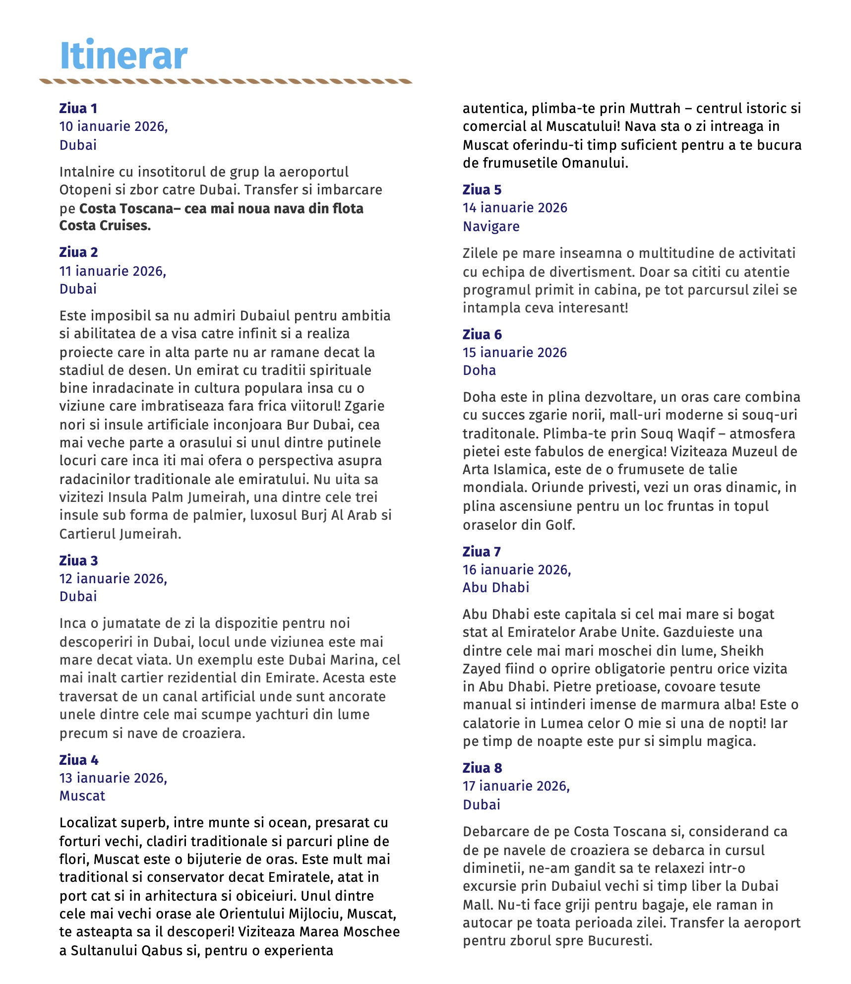 Avem planuri “croazieristice” pentru ianuarie 2026, vom vizita Dubaiul, Muscatul, Doha și Abu Dhabi la bordul vasului de croazieră Costa Toscana. Doar că de data asta Noel va rămâne acasă cu bunicii, ca să experimentăm tot ce ne poate oferi vasul de croazieră.