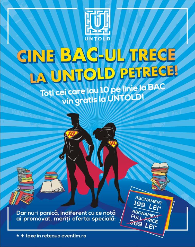 Oamenii din spatele Untold știu să își facă PR de calitate. Au anunțat astăzi că absolvenții de liceu care iau Bacalaureatul cu 10 pe linie vor fi omeniți cu un abonament la Untold Festival, iar cei care îl iau cu note între 6,00 și 9,99 pot să își cumpere abonamentul care e în mod normal 369 lei cu doar 199 lei (+ taxe în rețeaua eventim.ro). Spor la tocit, copii!